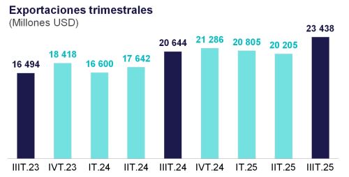 Las exportaciones de productos peruanos ascendieron a 23,438 millones de dólares durante el tercer trimestre del 2025, lo cual representó un crecimiento de 13.5%, en comparación con lo registrado en igual periodo del año anterior (20,645 millones de dólares), informó hoy el Banco Central de Reserva (BCR).