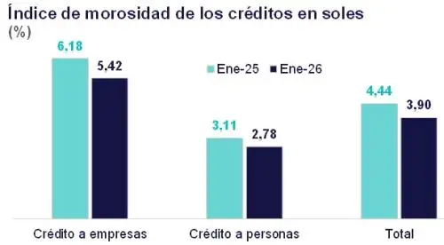 En concordancia con la evolución a la baja de las tasas de interés, la morosidad de los créditos en soles disminuyó de 4.44% en enero de 2025 a 3.90% en enero del 2026.