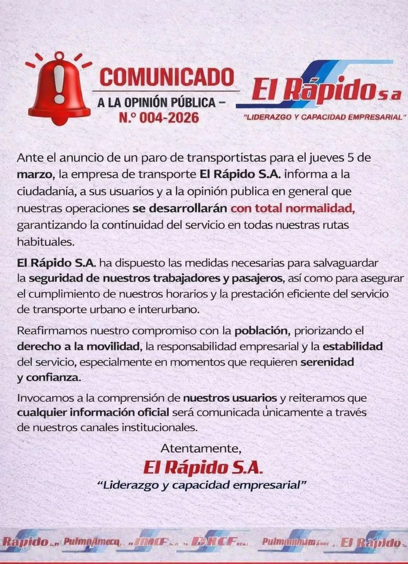 Conductores y cobradores de distintas empresas, como El Rápido, El Tigrillo, Chimpún Callao, salieron a trabajar con normalidad desde muy temprano. "Nuestras operaciones se desarrollan hoy con total normalidad, garantizando el servicio en todas sus rutas habituales", señala un comunicado de la empresas El Rápido.