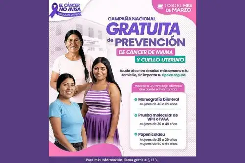 El Ministerio de Salud (Minsa) prosigue con la campaña gratuita de prevención del cáncer de mama y de cuello uterino durante todo este mes de marzo, independientemente del tipo de seguro que se posea y con solo presentar el DNI o carné de extranjería.