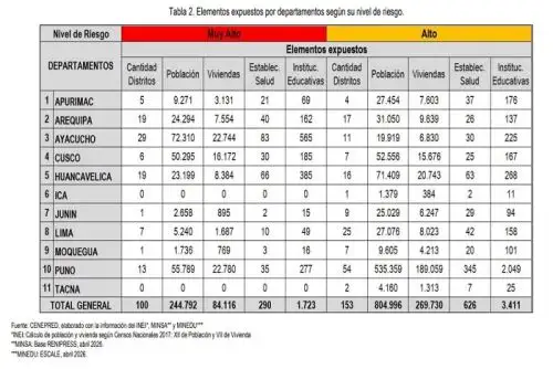 Según dicho documento, Ayacucho es el departamento que presenta la mayor cantidad de distritos en riesgo muy alto, con 29, seguido de Arequipa (19), Huancavelica (19), Puno (13), Lima (7), Cusco (6), Apurímac (5), Junín (1) y Moquegua (1).