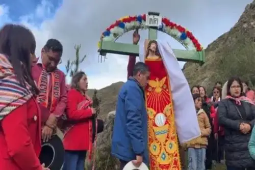 Un camino accidentado que pone a prueba la fe a primera hora de la mañana del sábado. Los feligreses del barrio de arriba se congregaron en el Santuario Espíritu Santo "Jogorón", ubicado en lo alto de un cerro. Hay rezos y ofrendas andinas como la masticación y compartición de coca – signo de respeto a la tierra y religiosidad.