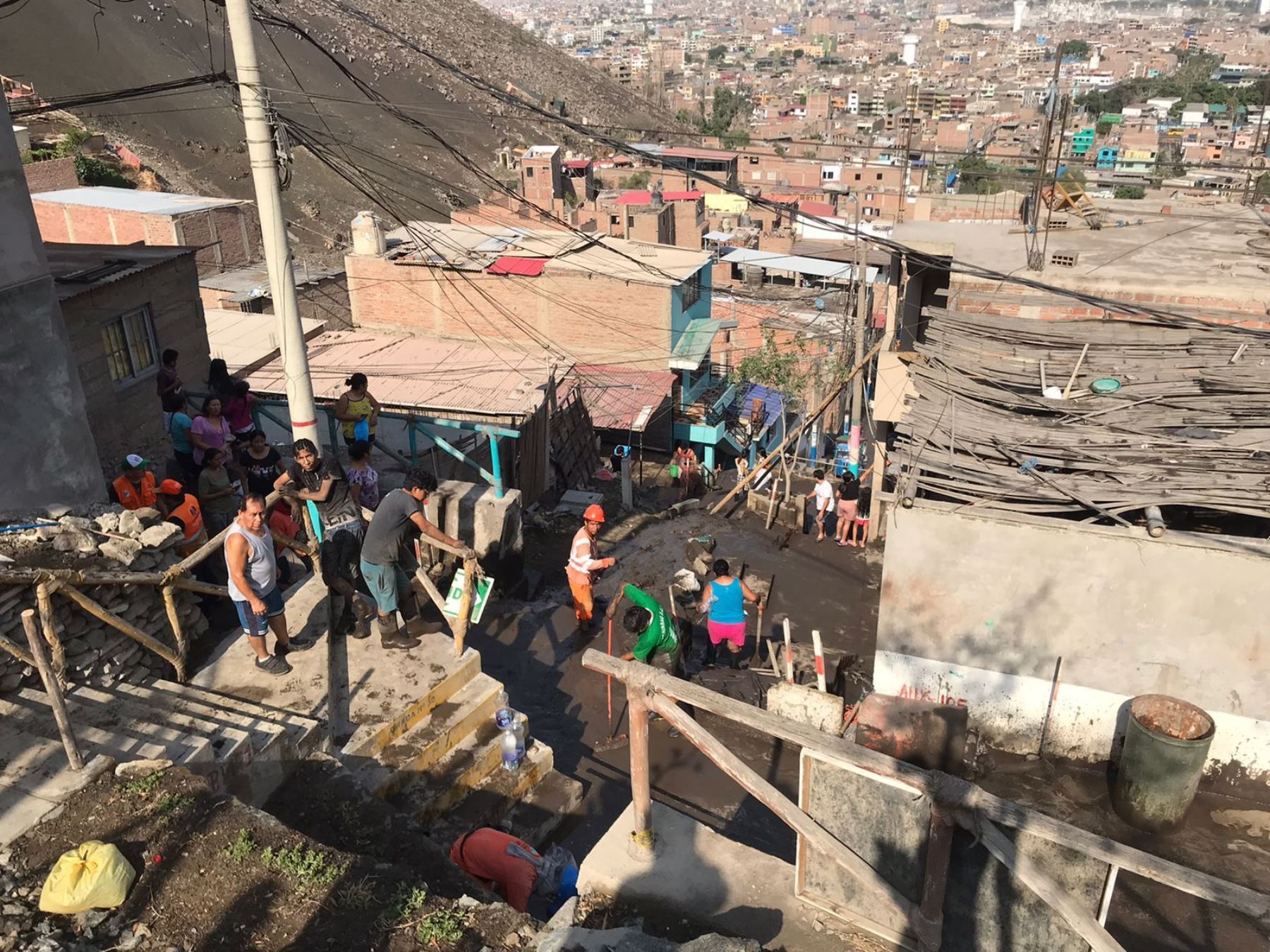 El Centro de Operaciones de Emergencia Nacional (COEN-Indeci) dio cuenta de lo sucedido en el cruce de la Av. El Progreso con Jr. La Cruz, donde los propios habitantes utilizaron escobas, baldes y otros implementos para limpiar las calles y veredas por donde diariamente transitan.