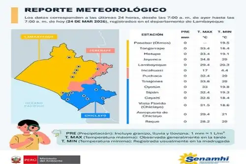Según el informe, varias localidades alcanzaron temperaturas máximas elevadas, destacando Jayanca con 34.8 °C, seguida de la estación  Tinajones en Chongoyape con 33.6 °C, y Tongorrape y Motupe, ambas con 33.4 °C. Estas cifras reflejan un incremento del calor, especialmente en zonas del norte y centro del departamento.