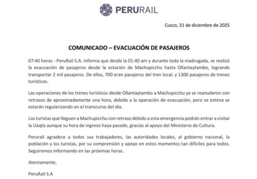 “Las operaciones de los trenes turísticos desde Ollantaytambo a Machu Picchu ya se reanudaron con retrasos de aproximadamente una hora, debido a la operación de evacuación, pero se estima se estarán regularizando en el transcurso del día”, señala el documento.