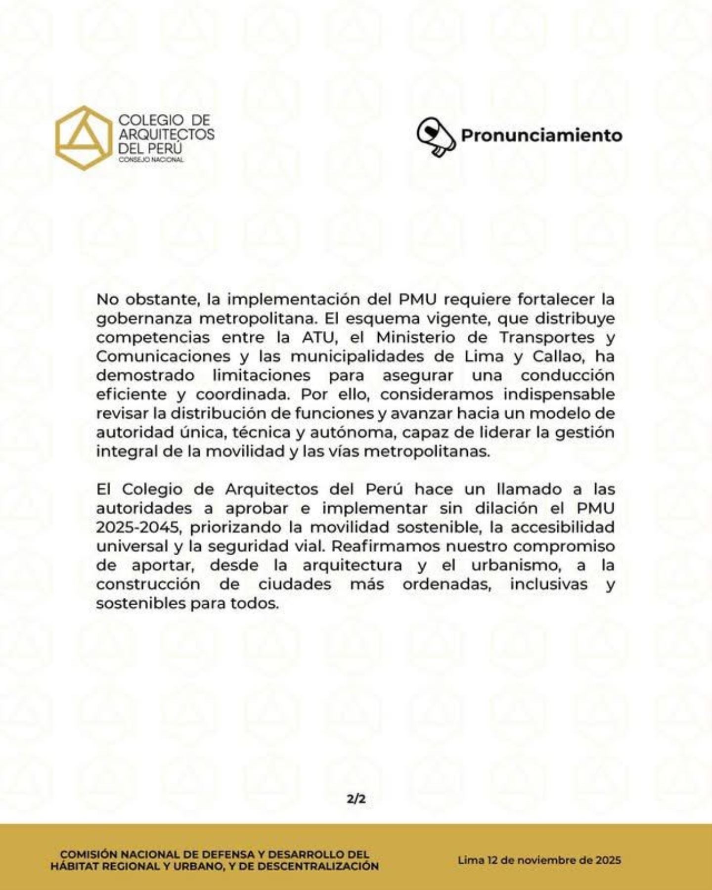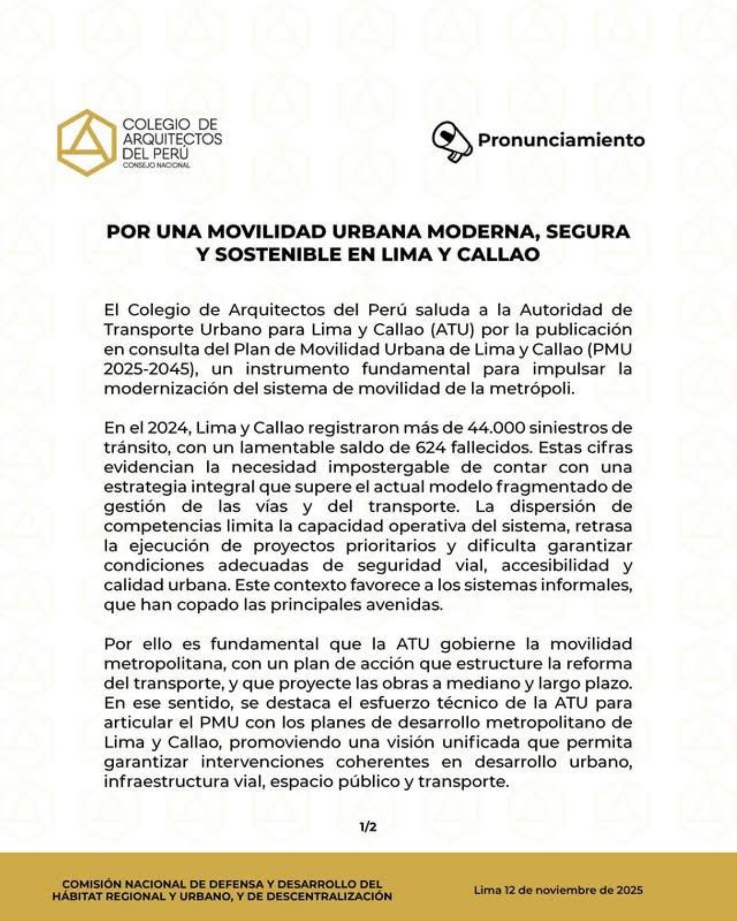 El Colegio de Arquitectos del Perú (CAP) enfatizó la urgencia de establecer una autoridad única para la gobernanza del transporte de Lima que asegure mayor efectividad en la solución al caos vehicular de la capital. Exhortó aprobar cuanto antes el Proyecto de Movilidad Urbana (PMU) 2025-2045, que se encuentra actualmente en consulta.