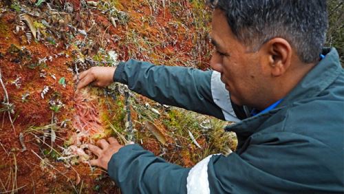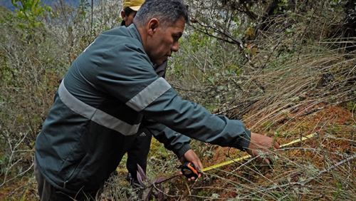 Víctor Villa Mariño, especialista en plantaciones forestales de la ATFFS Sierra Central del Serfor, dirigió el recorrido técnico en las laderas del cerro Kinkish, a más de 3700 m.s.n.m, donde se efectuaron muestreos en lugares con alta humedad relativa, que favorecen el
