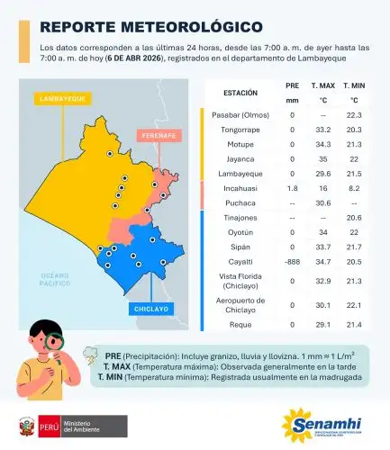 El intenso calor continúa marcando la pauta en el departamento de Lambayeque, donde el distrito de Jayanca se posicionó como el más caluroso de la región al registrar una temperatura máxima de 35 °C, según el último reporte del Senamhi correspondiente al 6 de abril de 2026.