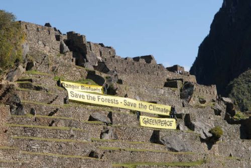 El jueves 15 un grupo perteneciente al citado movimiento ecologista realizó una manifestación en el más emblemático sitio arqueológico peruano utilizando cartelones en los que se pedía la conservación de los bosques.