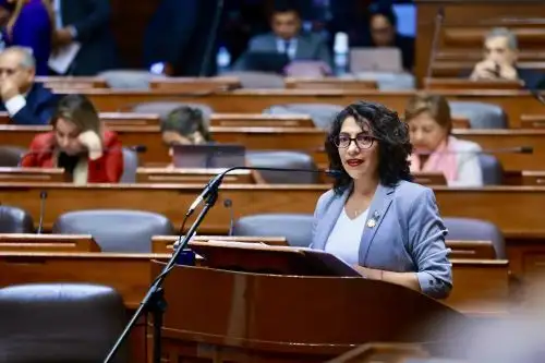 La ministra de Desarrollo e Inclusión Social, Leslie Urteaga Peña, se presenta ante el Pleno del Congreso y responde al pliego interpelatorio respecto al tema de los alimentos distribuidos por el Programa Nacional de Alimentación Escolar Comunitaria Wasi Mikuna que han causado intoxicaciones en diversos lugares del país.