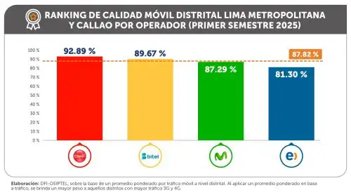 En el primer semestre de 2025, el desempeño en la prestación del servicio de voz y datos en redes móviles en Lima Metropolitana y Callao registró un promedio de 87.82%, lo que reflejó una mejora de 8.92 puntos porcentuales respecto a igual periodo del año pasado (78.90%), de acuerdo con el Ranking de Calidad Móvil Distrital 2025, elaborado por el Organismo Supervisor de Inversión Privada en Telecomunicaciones (Osiptel).