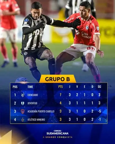 El Grupo B es liderado por Cienciano (7 puntos) luego lo siguen Juvenutd (4), Academia Puerto Cabello (3) y Atlético Mineiro (3).