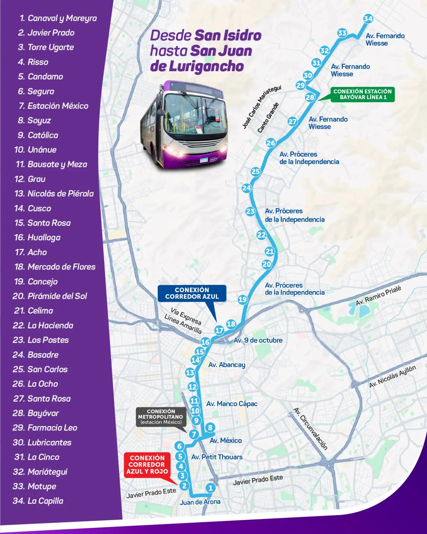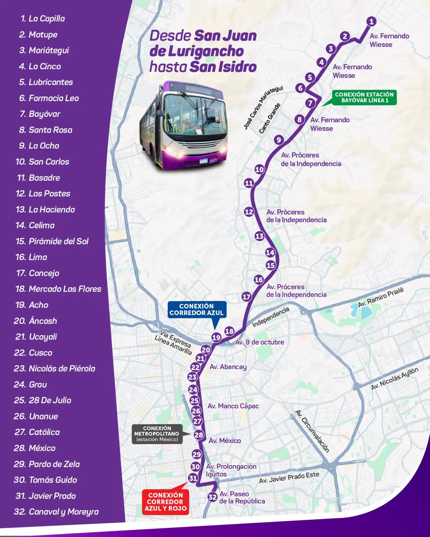 La Autoridad de Transporte Urbano (ATU) para Lima y Callao informó que el servicio extraordianrio 09 del Corredor Morado permitirá a los vecinos de San Juan de Lurigancho (SJL) viajar directamente desde la estación Bayóvar hasta el distrito de San Isidro en un solo vehículo, pagando S/ 2.80 el pasaje general y S/ 1.40 por medio pasaje para escolares, universitarios y estudiantes de institutos. Aquí te detallamos la ruta completa.