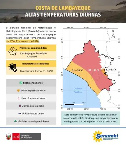Igualmente, En localidades más cálidas como Olmos y Motupe, los valores podrían llegar hasta los 36 °C. Durante la noche, en tanto, se esperan temperaturas entre los 21 °C y 23 °C en toda la franja costera.