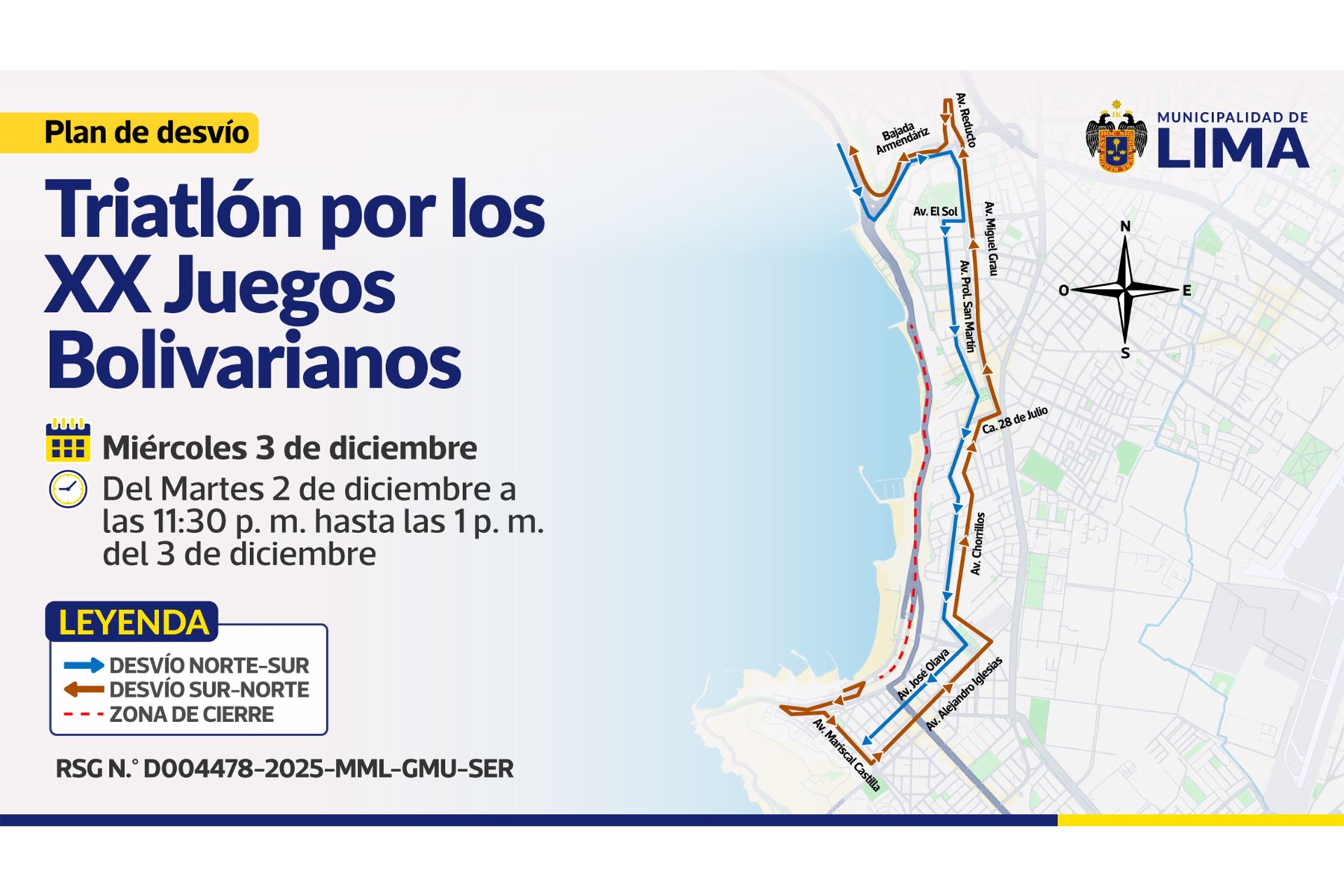 En tanto, otro cierre ocurrirá el martes 2 de diciembre a las 11:30 p.m. hasta 1 p.m. del 3 de diciembre por la competencia de Triatlón. En este caso el cierre de la vía es mayor. El desvío norte sur empieza por Armendariz, El Sol, San Martín y José Olaya; de sur a norte comienza por Mariscal Nieto, y sigue por las avenida Alejandro Iglesias, Chorrillos, Miguel Grau, Reducto y bajada Armendariz.