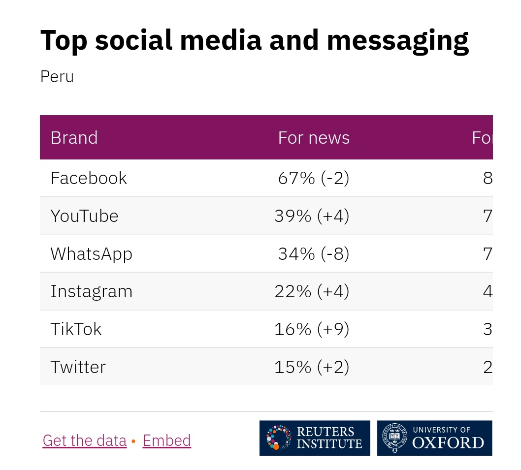 El estudio Digital News Report 2022 del Instituto Reuters, que presenta un análisis sobre los medios de comunicación en 46 países, revela que Facebook es la red social más empleada (67%) por los usuarios peruanos para consumir noticias, sin embargo, TikTok y YouTube son las que han generado mayor crecimiento en el último año.