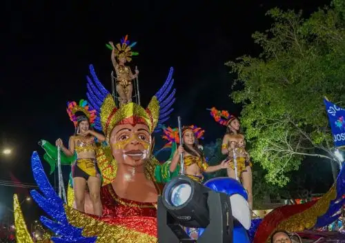 Los carros alegóricos pasean por las calles; mientras los viajeros y pobladores se mueven al ritmo de danzas folclóricas. Algunos de ellos juegan lanzando agua, pintura y talco.