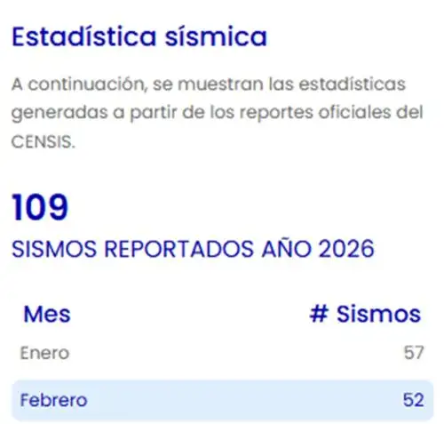 Según estadísticas del Centro Sismológico Nacional (Censis) del Instituto Geofísico del Perú (IGP), desde el 1 de enero hasta hoy, 27 de febrero, se han reportado un total de 109 eventos telúricos. La intensidad de estos eventos osciló entre los 3,5 y 5,3 de magnitud.