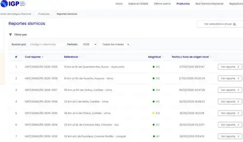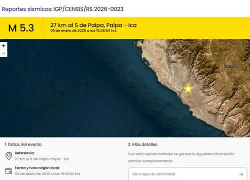 Según el Censis del IGP, el evento telúrico más fuerte en lo que va del 2026 se registró en el distrito de Palpa, provincia del mismo nombre, departamento de Ica, que el 9 de enero reportó un sismo de magnitud 5,3 y con una profundidad de 48 kilómetros y una intensidad de III-IV.