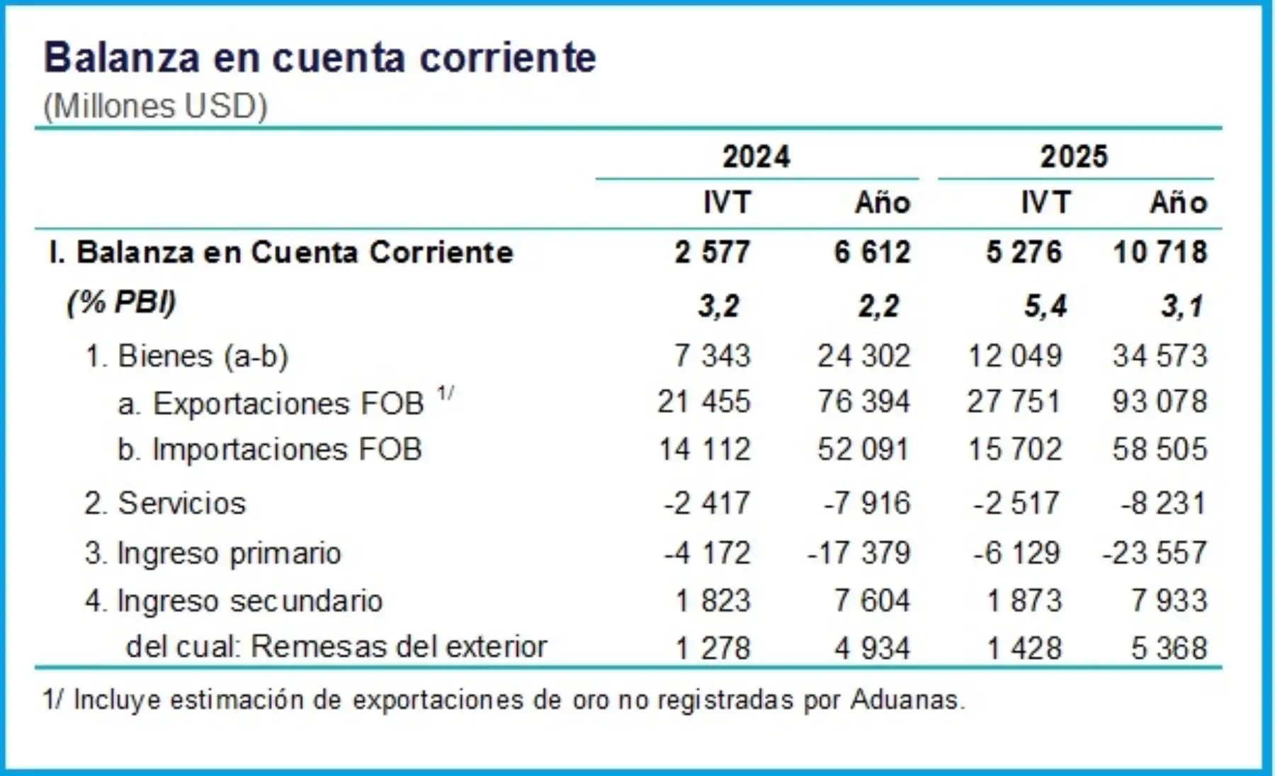 En términos trimestrales, la cuenta corriente registró un superávit de 5,276 millones de dólares en el cuarto trimestre de 2025, equivalente a 5.4% del PBI.