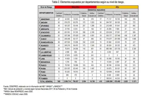 Los departamentos con nivel de riesgo Alto comprenden una población expuesta de 2048408 habitantes; 720783 viviendas; 1232 establecimientos de salud y 4819 colegios.