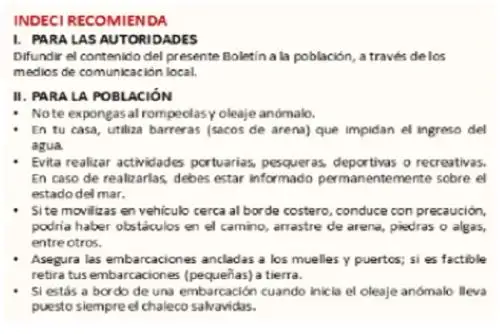 Estos oleajes tendrán mayor impacto en las áreas que tengan playas abiertas o semi-abiertas con orientación suroeste, por lo que se recomienda a los gobiernos regionales, locales, capitanías de puerto y empresas de la comunidad acuática tomar las medidas de prevención necesarias para evitar accidentes y/o daños personales o materiales.