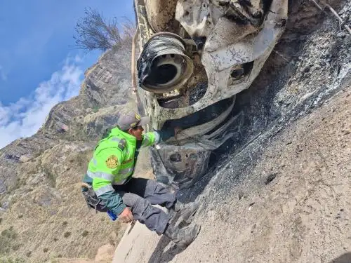Transeúntes alertaron a la policía y ellos a su vez divisaron el vehículo de placa de rodaje X40-349 con los neumáticos al cielo y en llamas, unos metros más allá hubo dos sobrevivientes que luego serían identificados como Silvio Rumualdo Ortega Canahuire y Flavio Apaza Medina, el primero de los nombrados conductor del auto.