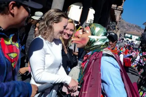Mientras las delegaciones hacen su paso, cusqueños y turistas acompañan el paso de las danzas, algunos logran grabar y fotografiar a sus integrantes que se muestran solícitos a los recuerdos, otros incluso pasan momentos agradables con las parodias de los ukukus y maqt’as, personajes que dan alegría.