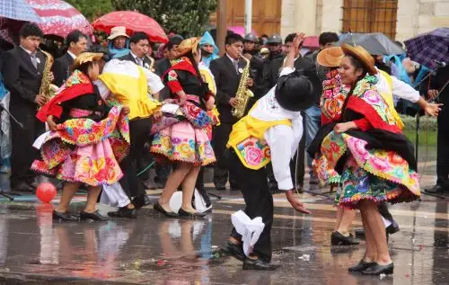 Cuarenta y seis asociaciones culturales de Huaylarsh y otras instituciones folclóricas de Huancayo y de otras provincias de Junín, bailaron desafiando a la lluvia y el viento en el parque Constitución al celebrarse en la víspera, 10 de febrero, el Día del Huaylarsh.