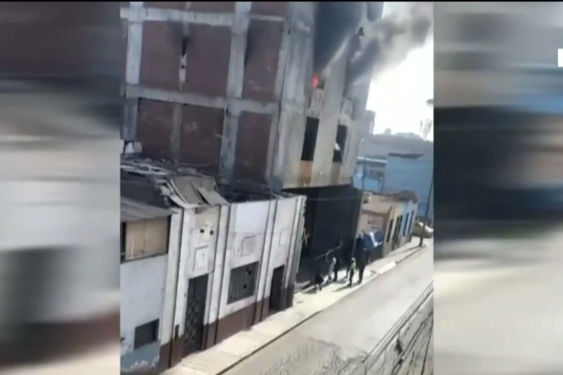 La zona ha sido acordonada por agentes policiales para restringir el tránsito peatonal y facilitar las labores de los bomberos, quienes emplean una escala telescópica para acceder a los pisos superiores del edificio, donde se concentra el fuego desde el segundo nivel hacia arriba.