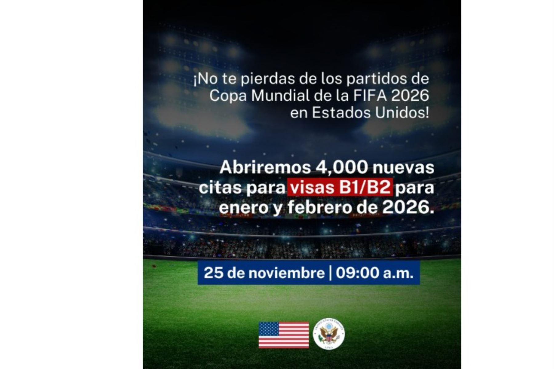 La Embajada de Estados Unidos en el Perú anunció que este martes 25 de noviembre, a las 9:00 a.m., habilitará 4,000 nuevas citas para las visas B1/B2, correspondientes a los meses de enero y febrero de 2026.