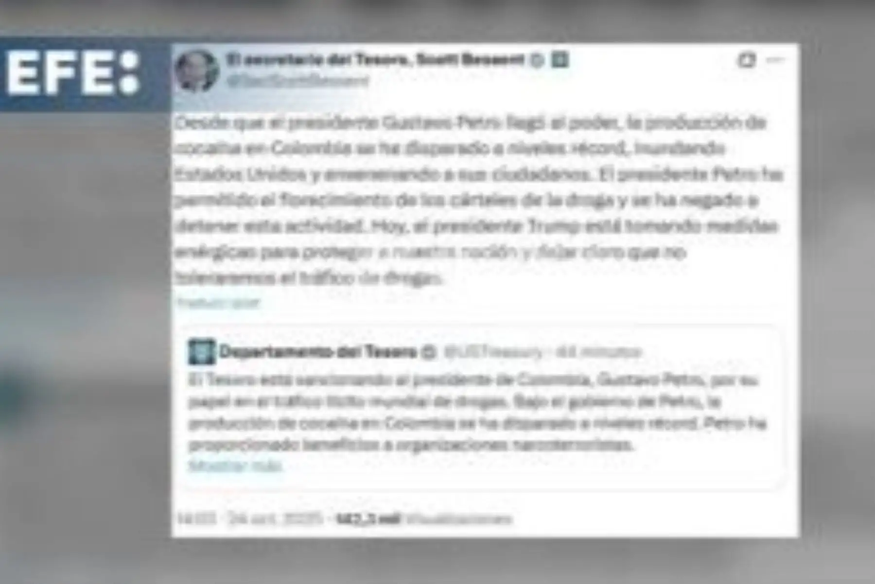 "Desde que el presidente Gustavo Petro llegó al poder, la producción de cocaína en Colombia se ha disparado a su nivel más alto en décadas, inundando Estados Unidos y envenenando a los estadounidenses", declaró el secretario del Tesoro, Scott Bessent, en un comunicado.