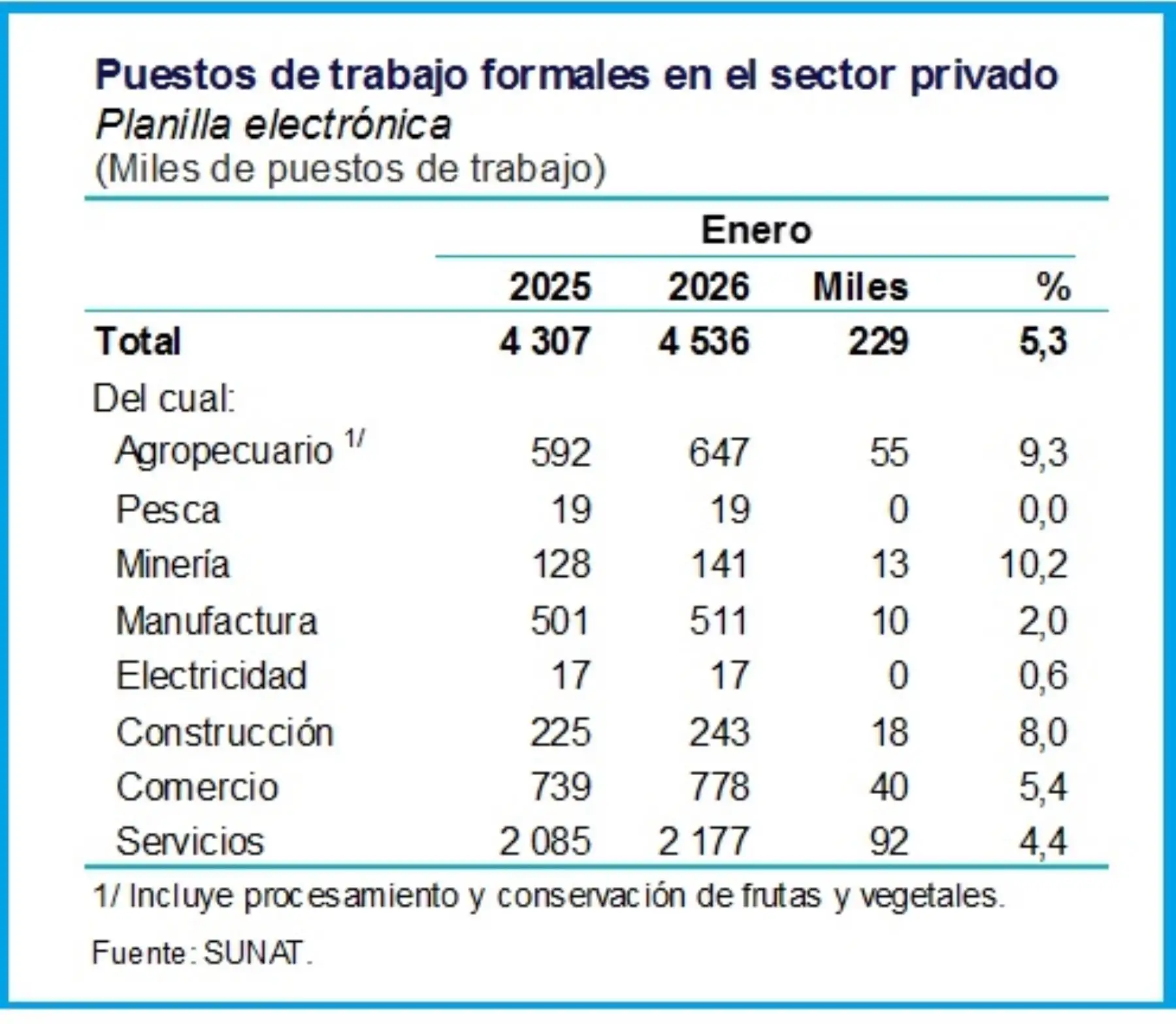 Por otra parte, el Banco Central precisó que en el sector privado, los puestos de trabajo formales experimentaron un aumento del 5.3% interanual en enero de este año.