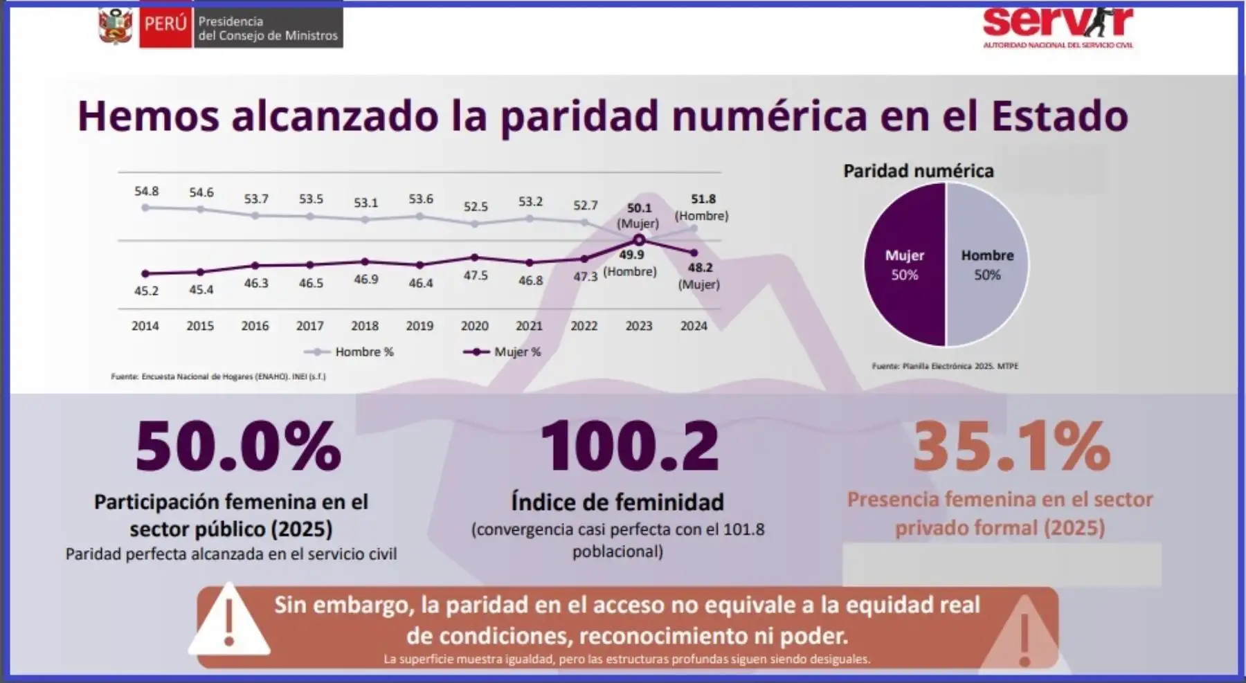 En el Perú, la participación laboral femenina en el sector público alcanzó la paridad “perfecta” del 50% respecto al personal masculino en el 2025, mientras que en el sector privado formal, la presencia femenina llegó al 35.1% en el mismo año, destaca el reciente informe “La Mujer en el Servicio Civil Peruano” publicado en marzo de este año por la Autoridad Nacional del Servicio Civil (Servir).