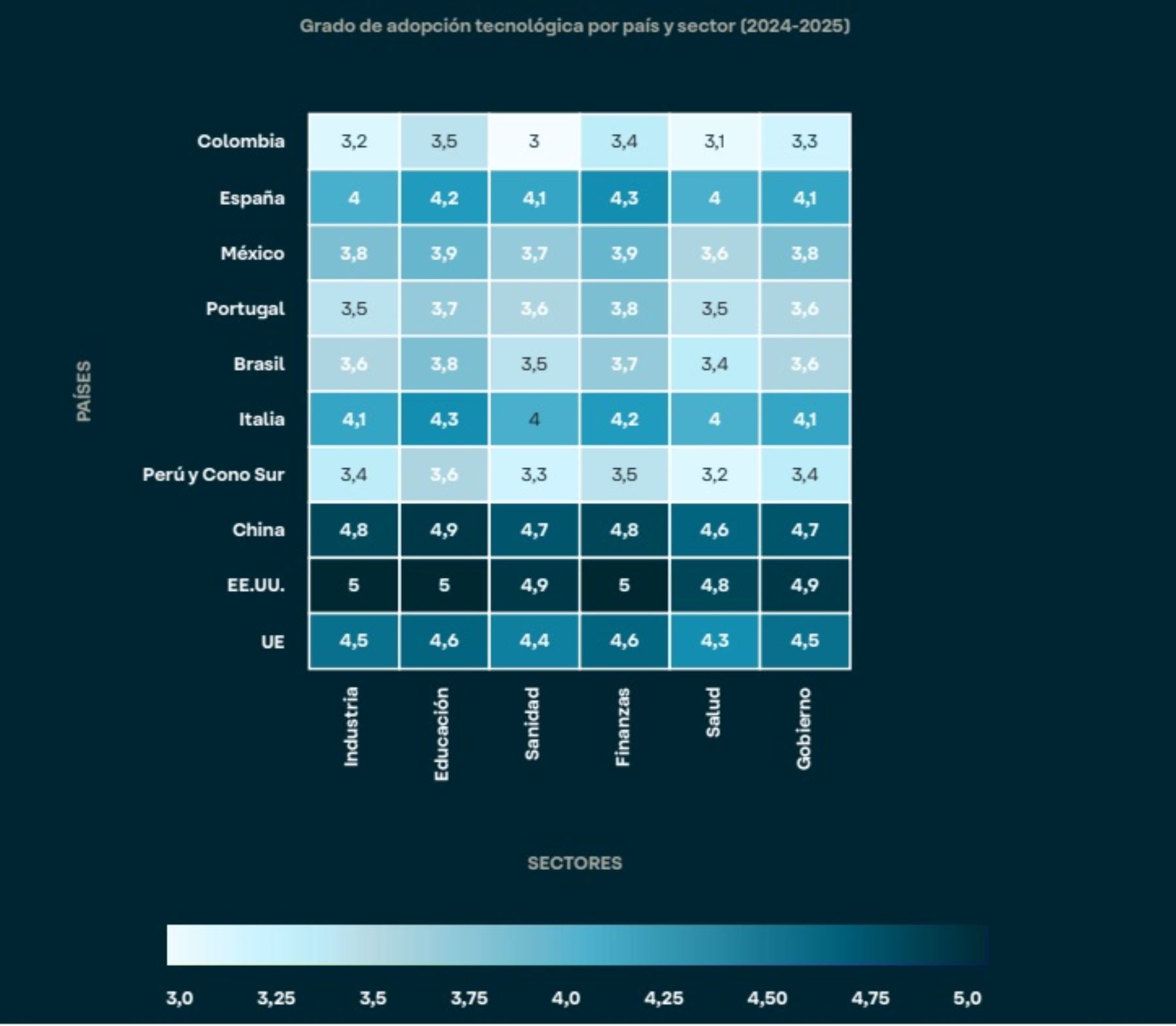 El informe también evalúa el nivel de adopción tecnológica del Perú en una escala del 1 al 5. Los resultados muestran un avance medio–alto, con sectores como finanzas, educación, industria y gobierno liderando el uso de herramientas como inteligencia artificial, ciberseguridad, nube híbrida y tecnología sostenible.