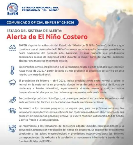 El jefe del Departamento de Oceanografía de la DHN, entidad que integra la Comisión Multisectorial encargada del Estudio Nacional del Fenómeno El Niño (Enfen) refirió que, debido a esta situación, el comunicado oficial N° 3 del Enfen cambió el estado de vigilancia a Alerta de El Niño Costero para los siguientes meses.