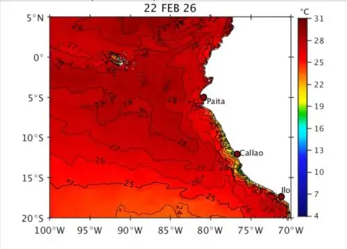 Ching consideró que otro factor clave para el acelerado aumento de la temperatura del mar es la llegada de ondas Kelvin cálidas, corrientes oceánicas que transportan agua caliente hacia la costa sudamericana. "Su arribo previsto para marzo contribuiría a intensificar el calentamiento superficial del mar", opinó.