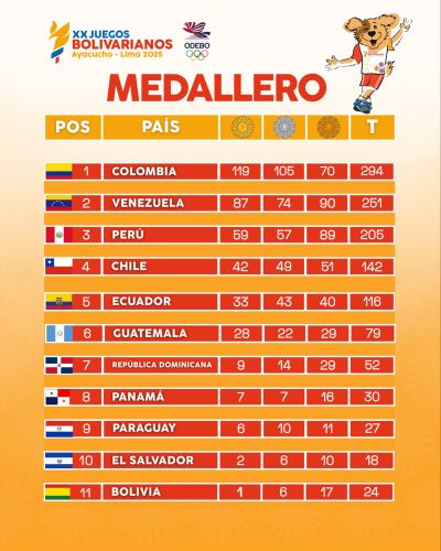 El esfuerzo de los deportistas nacionales en los Juegos Bolivarianos Ayacucho-Lima 2025 se ve reflejado en el cuadro medallero, donde el Team Perú ya traspasó las 200 medallas y va camino a imponer sus registros máximos en este certamen regional.