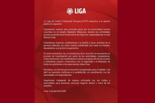 “Expresamos nuestro más profundo pesar por los lamentables hechos ocurridos en el estadio Alejandro Villanueva, durante las actividades previas al partido ante Universitario de Deportes, organizadas por el club Alianza Lima”, acotó la LFPP, al transmitir condolencias a la familia del fallecido.