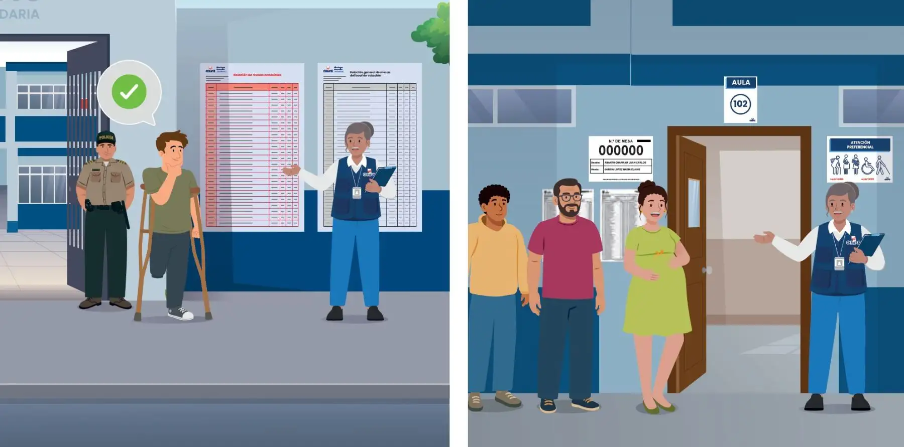 El personal de la ONPE, que estará identificado con chaleco azul, brindará orientación a los electores sobre cómo llegar a su aula de votación. También podrá acompañarlo dentro del local, si así lo desea.