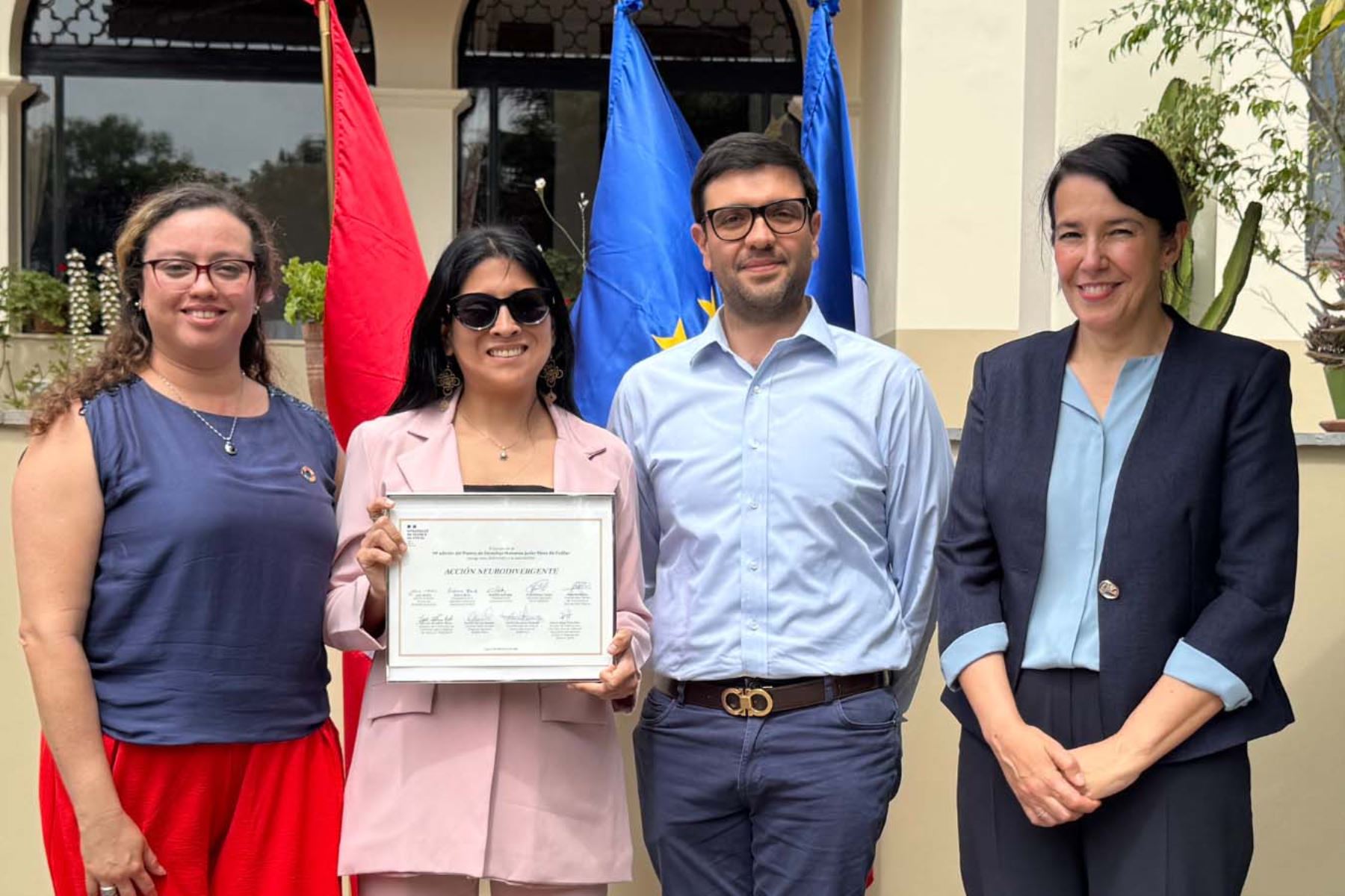 La Embajada de Francia otorgó el Premio de Derechos Humanos "Javier Pérez de Cuéllar" 2025 a los colectivos sociales "Acción Neurodivergente", "Aprodmayo" y "Ramas Conexiones Creativas", por su trabajo en la eliminación de la violencia contra la mujer, durante una ceremonia realizada en Lima.