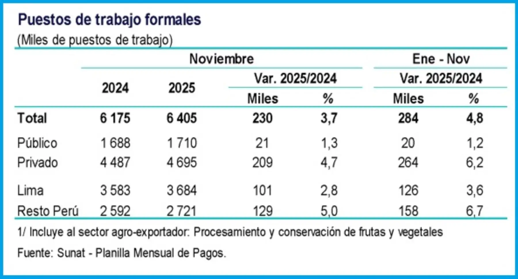 Por su parte, el empleo formal a nivel nacional creció 3.7% en noviembre del 2025 respecto al mismo período de 2024, según información de la planilla electrónica del Ministerio de Trabajo y Promoción del Empleo (MTPE), acumulando de esta manera 20 meses consecutivos de expansión.