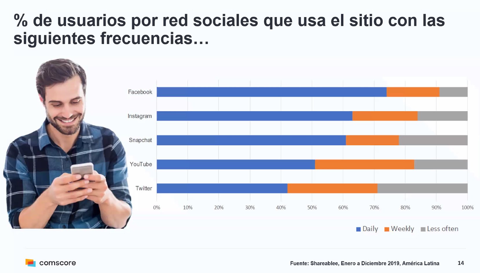 En cuanto al uso semanal, los usuarios de Latinoamérica prefieren Facebook (90%), así como Instagram y YouTube (80%).