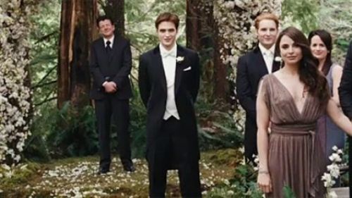 El romance de ficción del vampiro Edward Cullen (Robert Pattinson) y la joven Bella (Kristen Stewart), los protagonistas de Amanecer, de la saga Crepúsculo, culmina en boda y las primeras imágenes de la ceremonia efectuada en el bosque ya circulan en la red internacional.