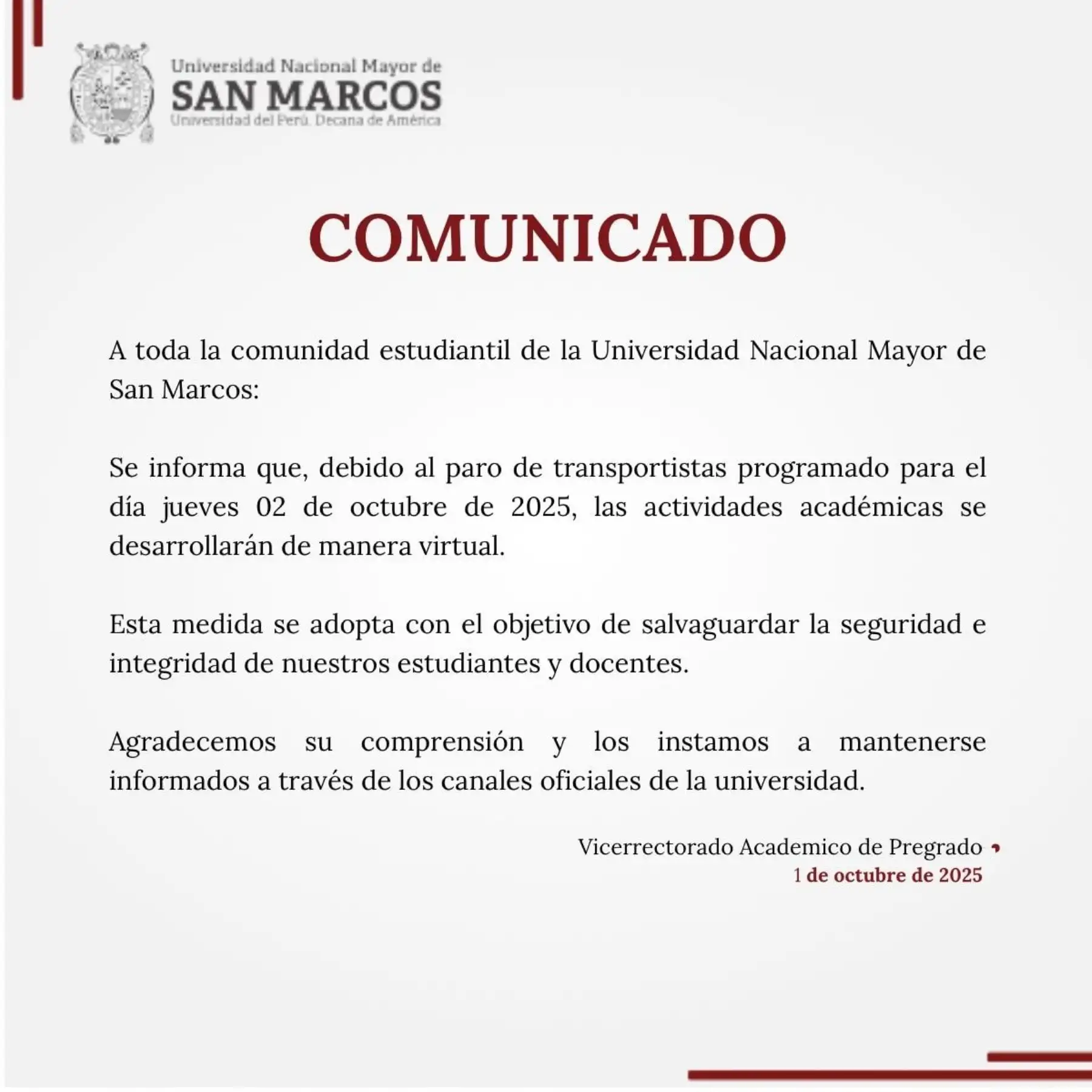 A través de un comunicado en las redes sociales, la Universidad Nacional Mayor de San Marcos (UNMSM) informó que todas sus actividades académicas del jueves se desarrollarán de forma remota.