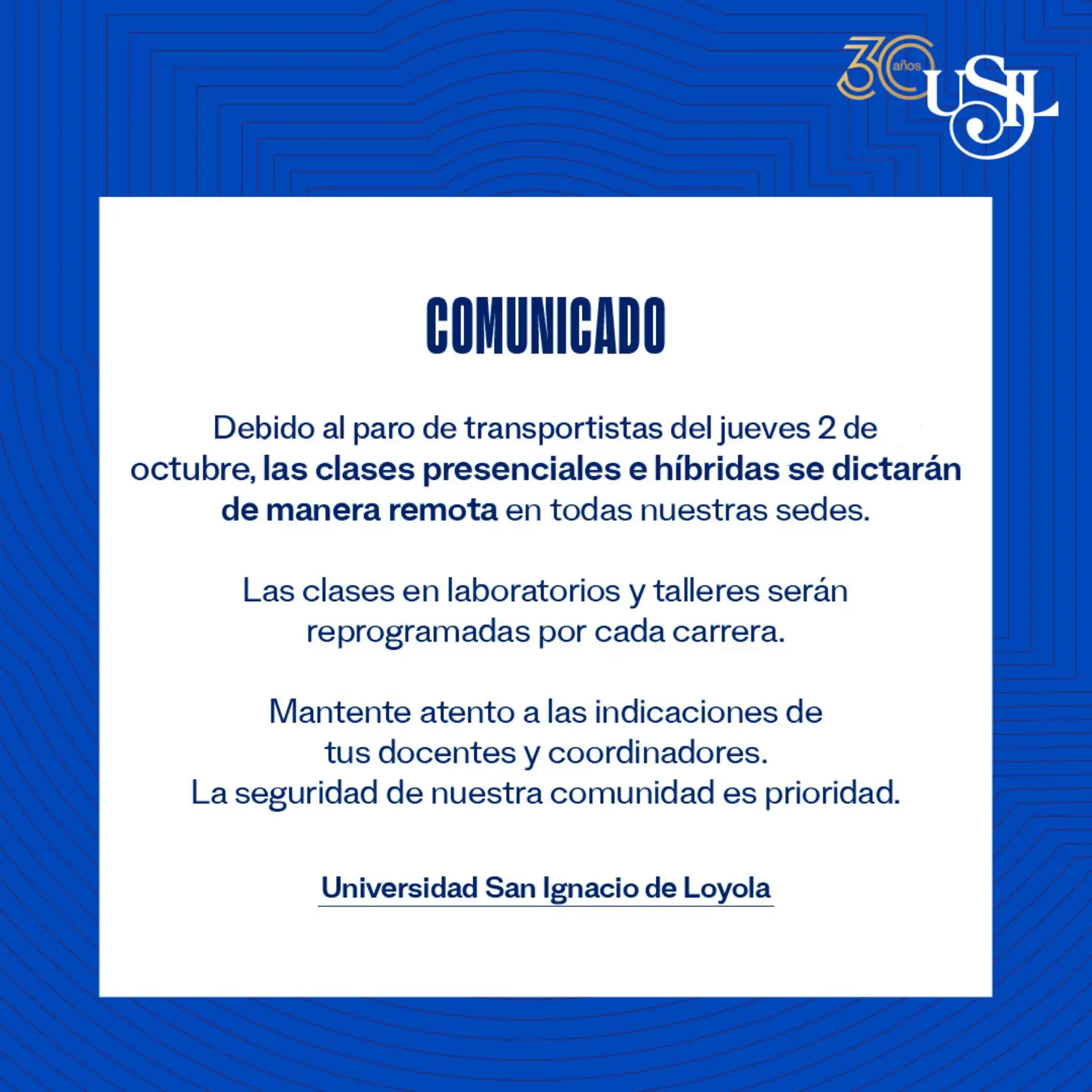 Por su parte, la Universidad San Ignacio de Loyola (USIL) comunicó que tanto las clases de pregrado como las de posgrado pasarán a modalidad virtual por un día, precisando que las evaluaciones y prácticas presenciales serán reprogramadas en nuevas fechas.