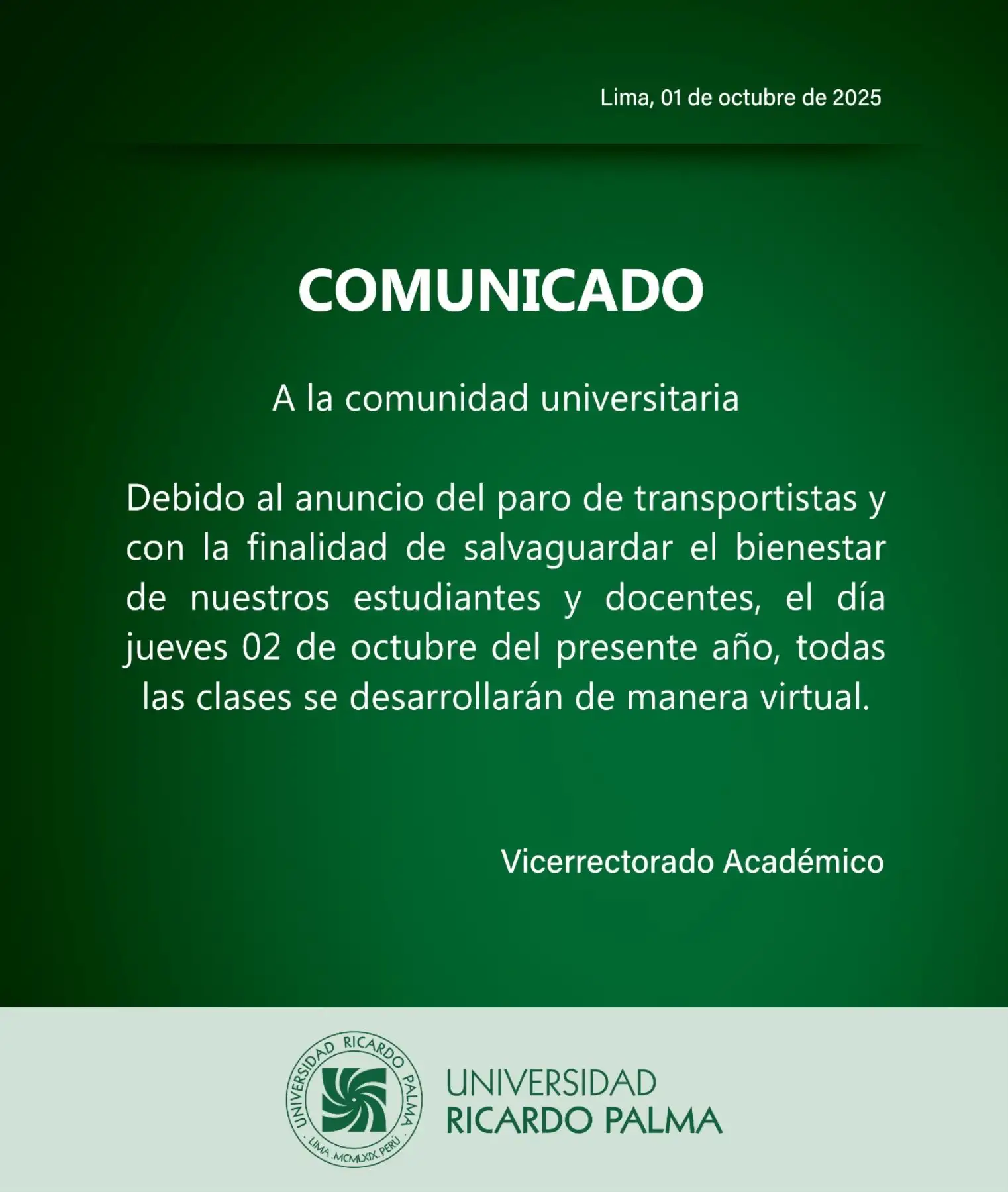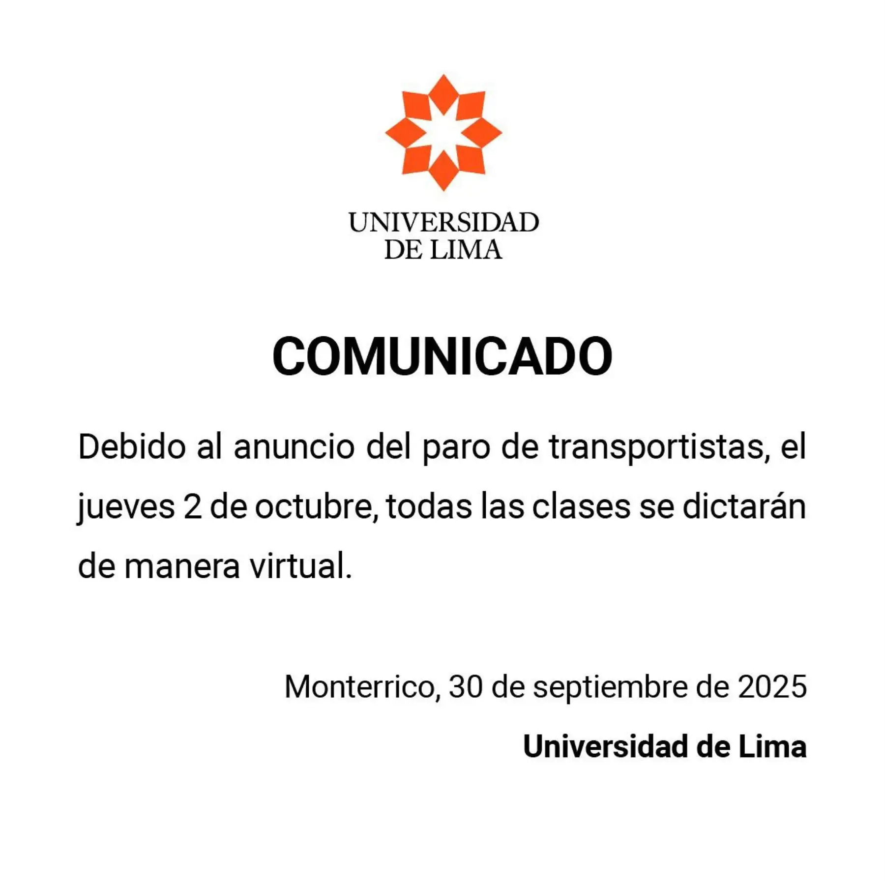 Diversas universidades de Lima anunciaron que el jueves 2 de octubre sus clases se dictarán de manera virtual ante el paro convocado por un sector de transportistas, a fin de garantizar la continuidad académica y proteger a la comunidad universitaria frente a las dificultades de movilidad que podría generar la protesta.