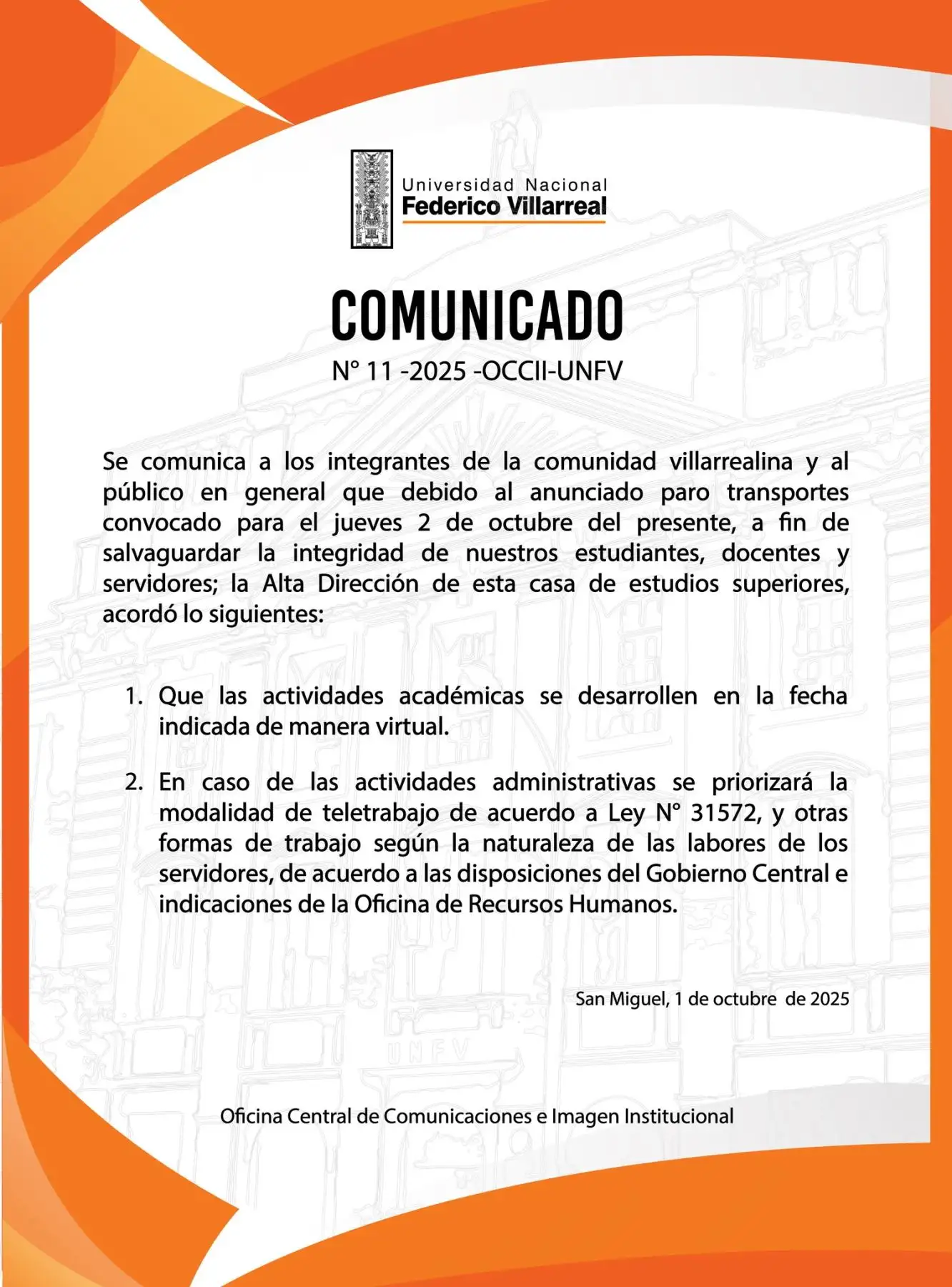 La Universidad Nacional Federico Villarreal (UNFV) también confirmó que aplicará la modalidad virtual durante la fecha del paro. Señaló que la medida busca garantizar el normal desarrollo de las actividades académicas sin exponer a los estudiantes a dificultades de traslado.