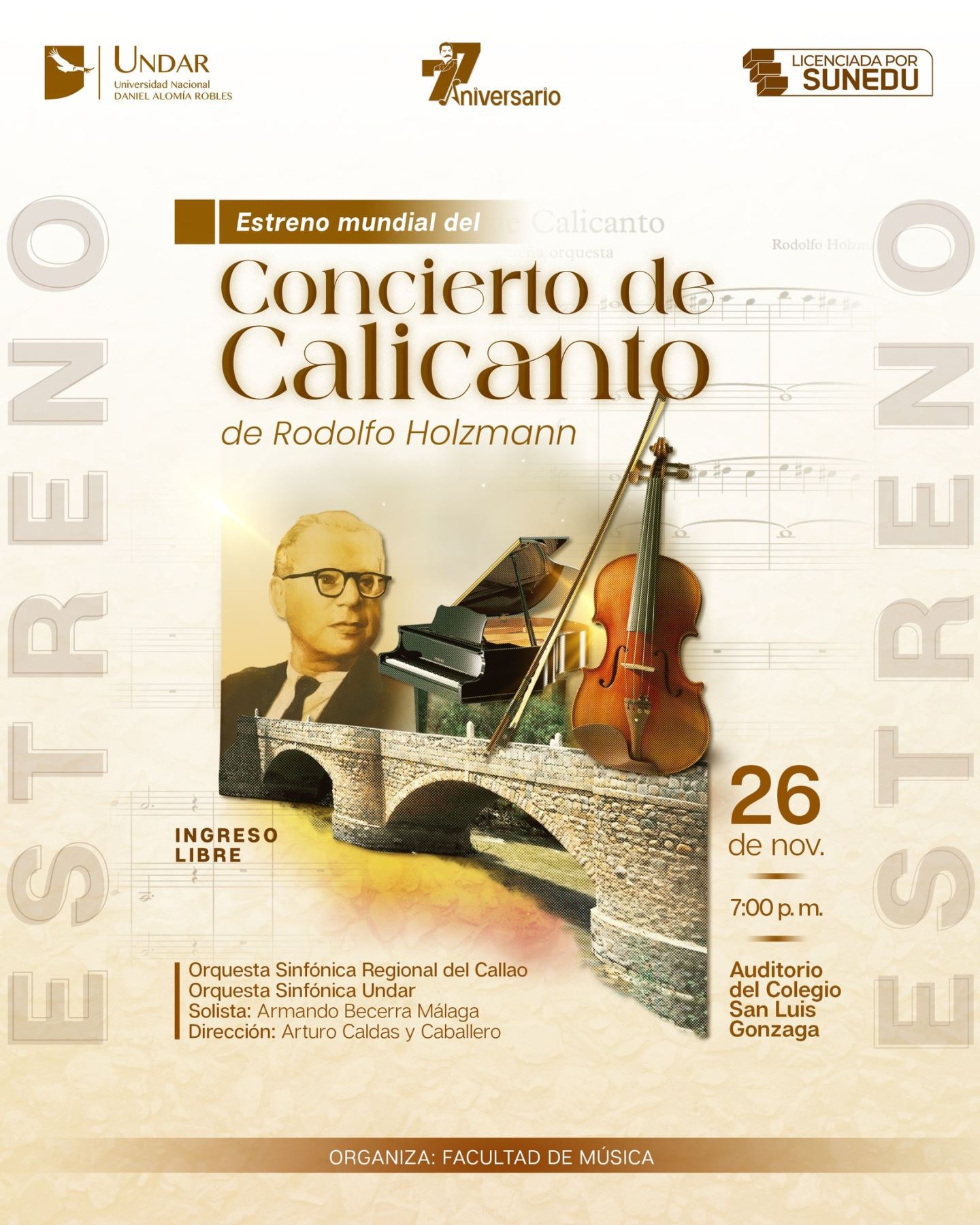 El ‘Concierto de Calicanto’ para arpa y orquesta, obra emblemática del compositor peruano-alemán Rodolfo Holzmann, se estrena este miércoles 26 de noviembre (7:00 de la noche) en el auditorio del colegio parroquial San Luis Gonzaga de la ciudad de Huánuco.