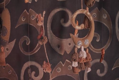 “Todas las obras han sido desarrolladas con la técnica de teñido en reserva, utilizando tintes naturales, barro y cera de abeja, y tomando como base la iconografía mochica, elemento central del trabajo”, apuntó el artista.